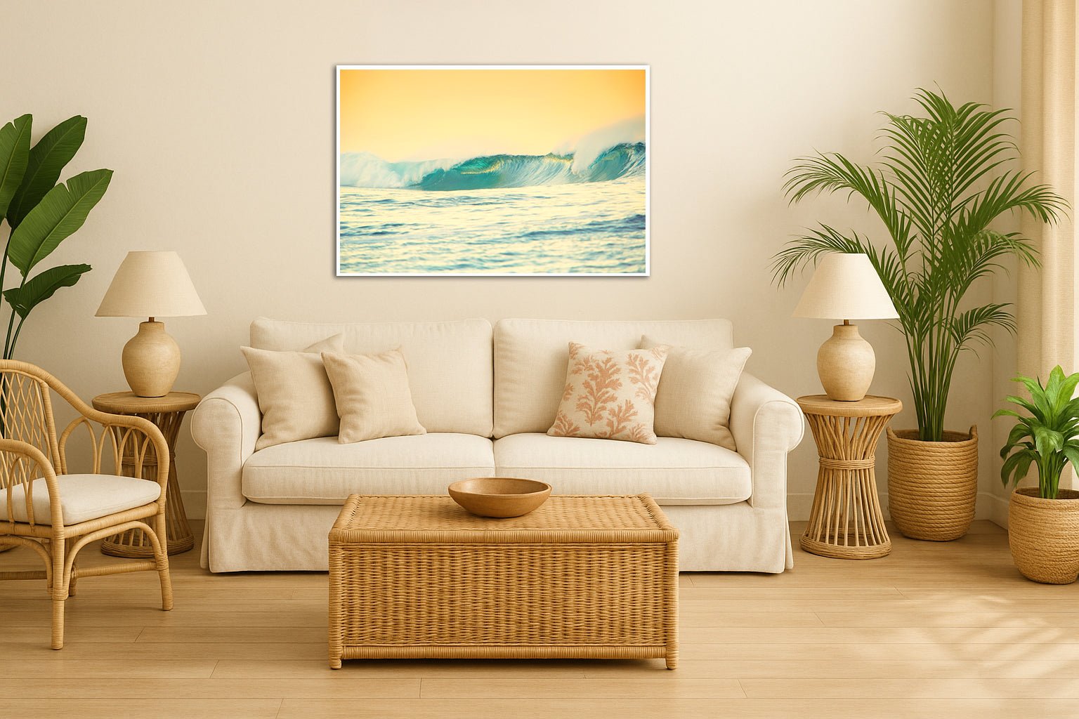 Golden sky and turquoise surf artwork shot in Tahiti